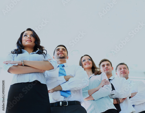 © ASDF, Obraz premium Happy young business woman with her team in background.