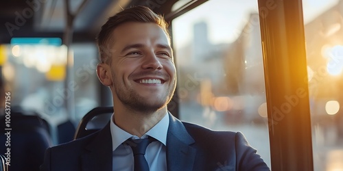 Naklejka premium Happy young businessman smiling while traveling by bus