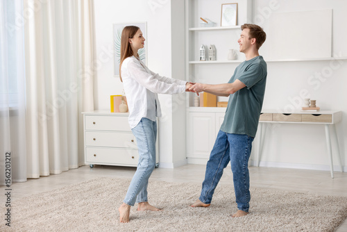 Obraz premium Happy young couple dancing together at home