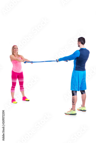 © cirkoglu, Naklejka premium Happy young couple doing exercise in pair with elastic rubber for pregnancy on the white background.