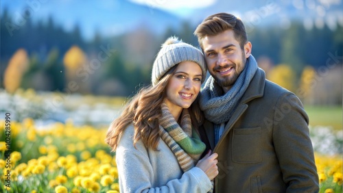 © N7, Fototapeta premium Happy Young Couple in a Winter Meadow with Green and Yellow Grass