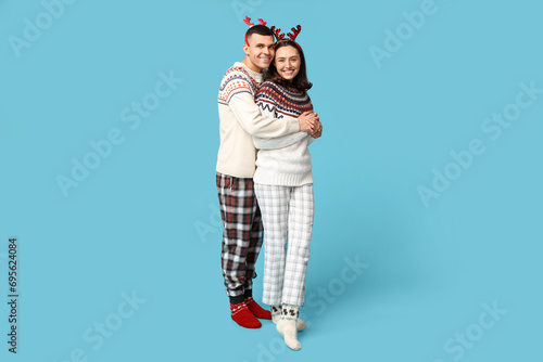 Fototapeta premium Happy young couple in Christmas pajamas hugging on blue background