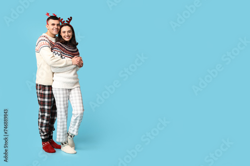 Fototapeta premium Happy young couple in Christmas pajamas hugging on blue background