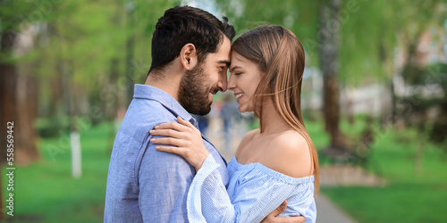 Fototapeta premium Happy young couple walking in park on spring day