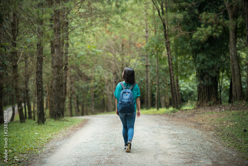 © Tony, Fototapeta premium Happy young cute asian girl hipster backpack women travelling looking at beautiful sky mountains scenery views