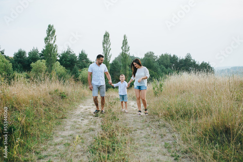 Obraz premium Happy young family father, mother and little son having fun outdoors, playing...
