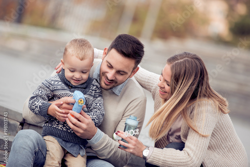 © ivanko80, Fototapeta premium Happy young family in city street,having fun.