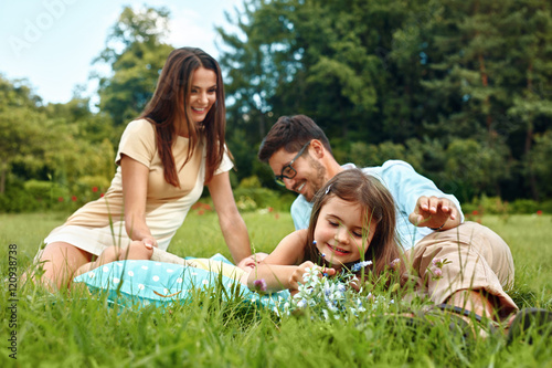 Fototapeta premium Happy Young Family In Park. Parents And Kids Having Fun, Playing
