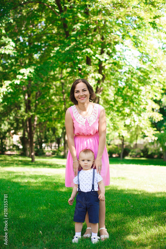 © nagaets, Fototapeta premium Happy young family spending time together outside in green nature.