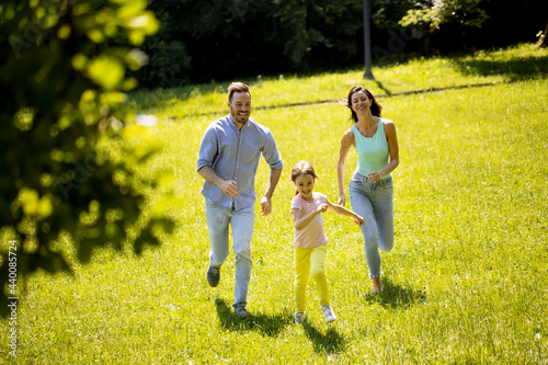 © BGStock72, Fototapeta premium Happy young family with cute little daughter running in the park on a sunny day