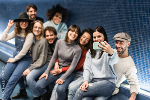 Obraz premium Happy young friends having fun doing selfie in metro subway station - Focus...