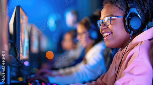 © Anna, Obraz premium Happy young gamer enjoying online gaming at a cyber cafe