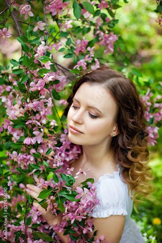 © Elena , Fototapeta premium Happy young girl enjoy peach blossom. Spring walk in the blooming garden