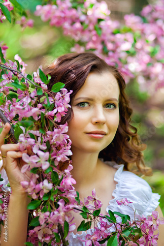 © Elena , Fototapeta premium Happy young girl enjoy peach blossom. Spring walk in the blooming garden