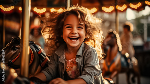 Obraz premium Happy young girl, merry-go-round, having fun at an amusement park. Generative AI