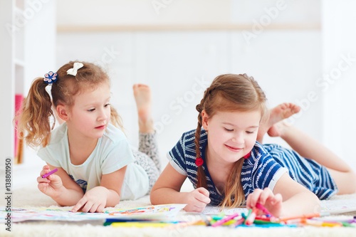 Fototapeta premium happy young girls, kids painting with felt pen together