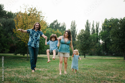 © sergiubirca, Fototapeta premium Happy young hipster family having fun while running, bowl, rising up, piggyback ride their children in park on summer sunset