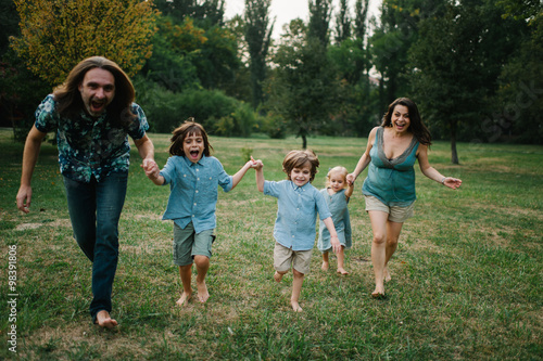 © sergiubirca, Fototapeta premium Happy young hipster family having fun while running, bowl, rising up, piggyback ride their children in park on summer sunset
