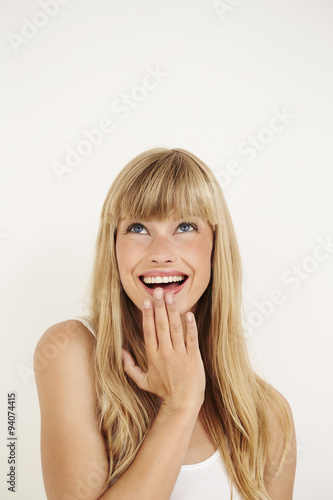 © sanneberg, Fototapeta premium Happy young lady looking up in studio