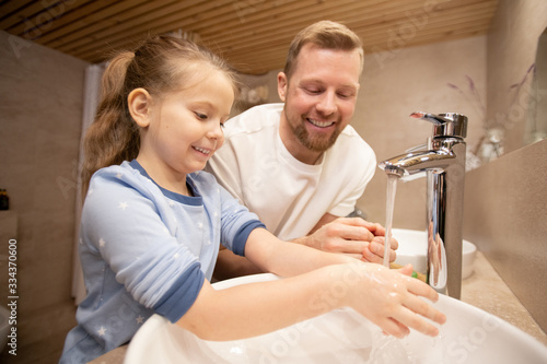 Fototapeta premium Happy young man looking at his cute little smiling daughter washing hands