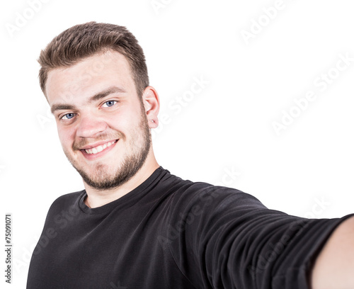 © beerlogoff, Obraz premium Happy young man taking a selfie photo on white background
