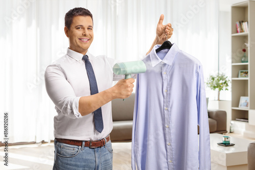 Obraz premium Happy young man using a hand steam iron for a shirt at home