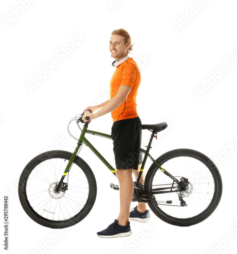© New Africa, Obraz premium Happy young man with headphones and bicycle on white background