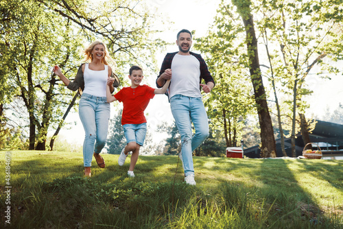 © gstockstudio, Obraz premium Happy young mother and father with little boy holding hands and walking outdoors