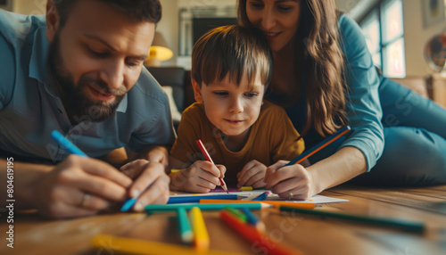 Fototapeta premium Happy young parents relaxing on couch while a child draws with colouring pencils