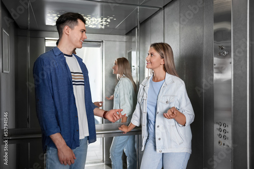 © New Africa, Obraz premium Happy young people talking in modern elevator
