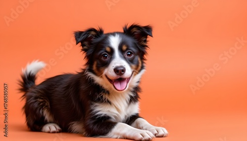 © wiwat01, Fototapeta premium Happy Young Puppy Laying on an Orange Background with a Playful Expression and Bright Eyes