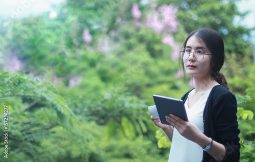 © mansong, Fototapeta premium Happy young student with a tablet and a disposable coffee cup sitting on the bench and reading in a summer park.