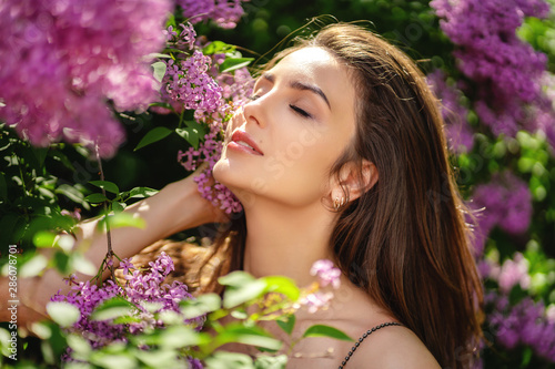 Fototapeta premium Happy young woman enjoying smell flowers over spring garden background
