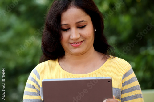 Fototapeta premium Happy young woman holding tablet computer at outdoor