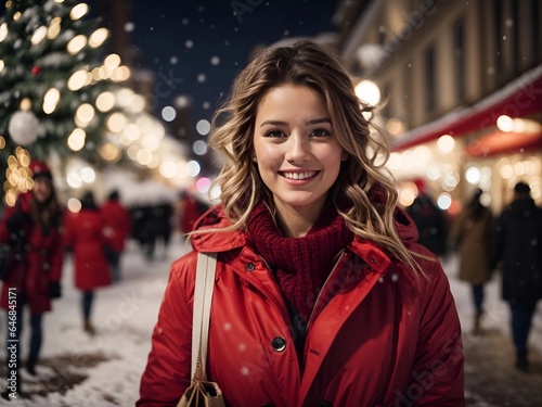 © New generate, Fototapeta premium Happy young woman in a snowy night, red coat, with christmas tree