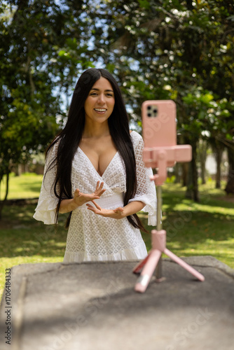 © Alejandro, Naklejka premium Happy young woman in a white dress records a video using her smartphone on a tripod in a rustic outdoor garden with greenery.