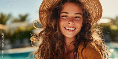Fototapeta premium happy young woman in straw hat on vacation