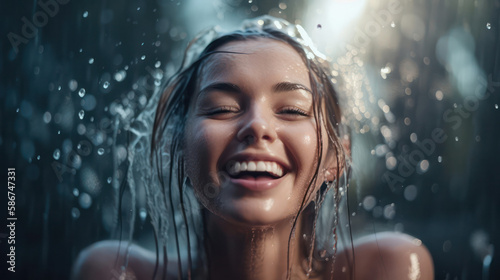 © Margo_Alexa, Fototapeta premium happy young woman laughing while getting wet in the sea or pool on a sunny day. generative AI