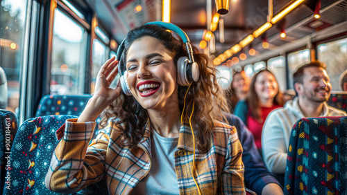 Obraz premium Happy young woman listening to music in the bus. Cheerful girl with...
