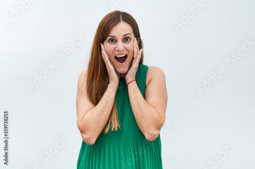 © Alvaro, Fototapeta premium Happy young woman making the surprised gesture on a white background.