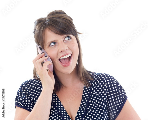 © Michael Chamberlin, Fototapeta premium Happy young woman on her cell phone; isolated on a white