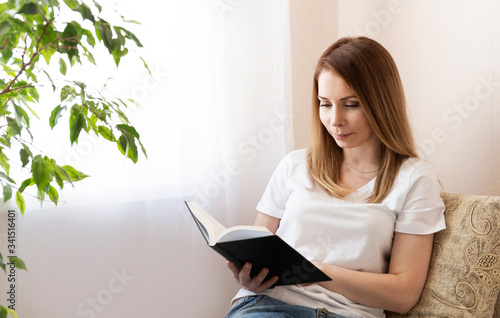 Fototapeta premium Happy young woman reading storybook on couch at home