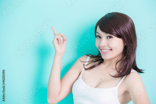 Fototapeta premium Happy young woman show something