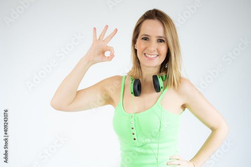 Fototapeta premium Happy young woman showing okay sign isolated over white background