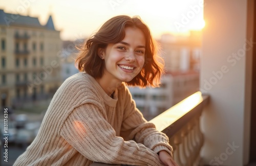 © Pete, Naklejka premium Happy young woman smiles at camera on city balcony at sunset. Girl enjoys warm golden hour light, relaxing, feeling joyful with urban view. Wears cozy sweater, enjoying city life at twilight. Genuine