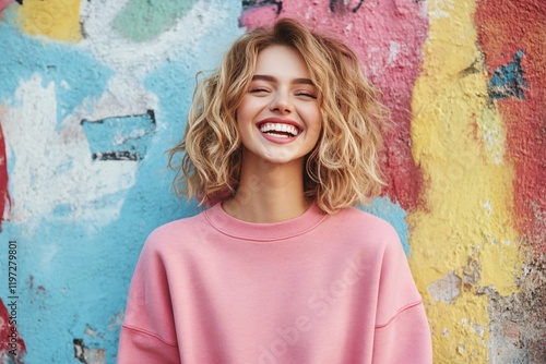 Obraz premium Happy Young Woman Smiling Brightly Against Colorful Graffiti Wall