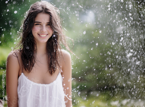 © larrui, Obraz premium Happy young woman smiling in a white dress, enjoying a refreshing summer rain with water droplets around her.