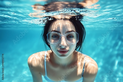 © vachom, Naklejka premium Happy young woman swimming underwater in the sea at the day time. Healthy lifestyle concept