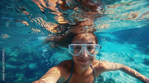 © Naknakhone, Fototapeta premium Happy young woman swimming underwater in the tropical ocean. copy space for text.