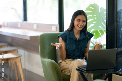 © Wasana, Naklejka premium Happy young woman takes a break from work to drink coffee and chat with people through her laptop camera in a coffee shop.